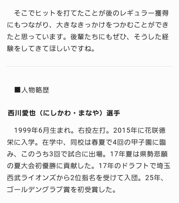 西川愛也(花咲徳栄高校)が紹介されています。