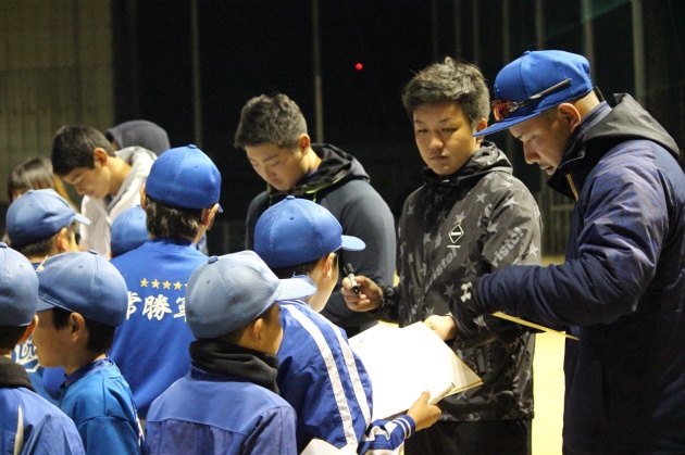 後輩のために練習に訪れてくれました。さらに愛斗選手(西武ライオンズ53番)も